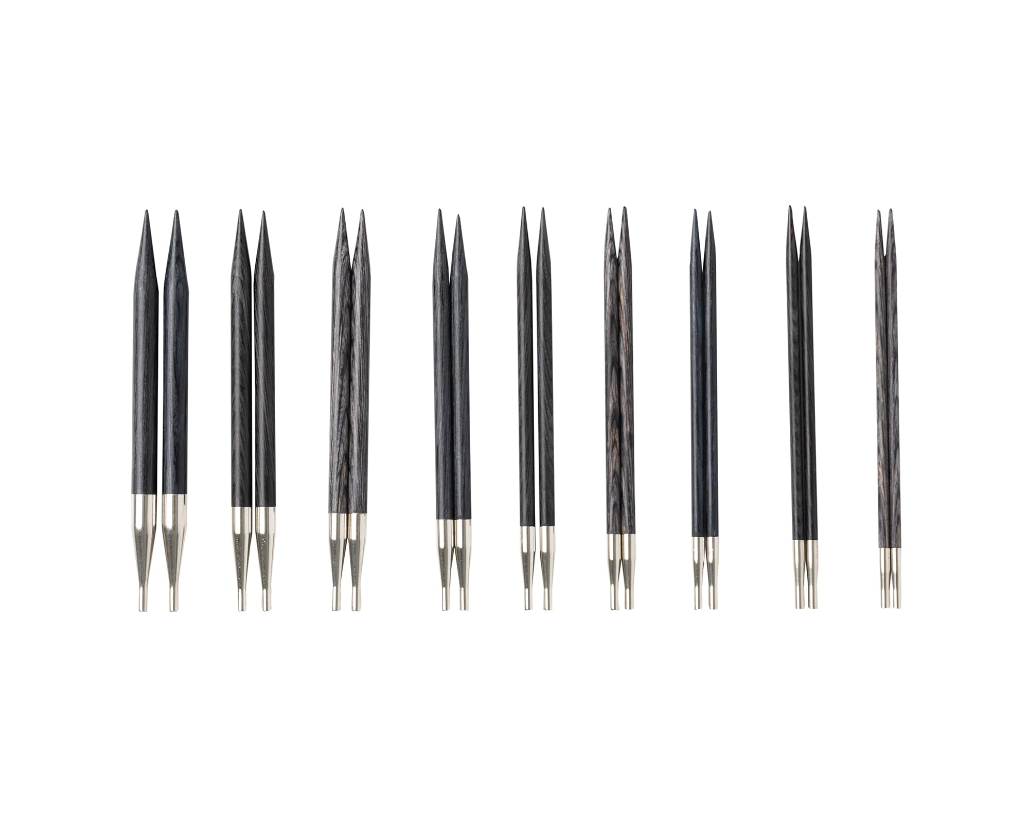 - INCLUDED: Set includes 9 pairs of 4.75" long interchangeable wood needle tips in US sizes 4-11 (3.5mm - 8mm), 7 black cables (2 - 24", 2 - 32", 1 - 40", 1 - 47", and 1 - 60" lengths)(sizing of the interchangeable cables refers to the total length achieved when the needle tips are attached to the cables), 8 black end caps, 3 cable connector, 3 metal tightening keys, locking stitch markers, and an exclusive interchangeable needle clutch